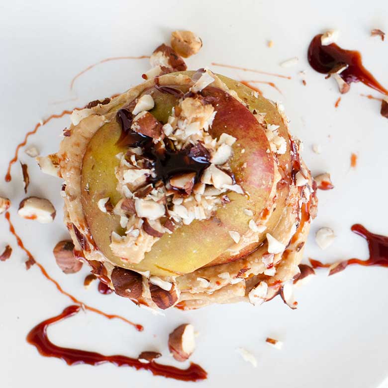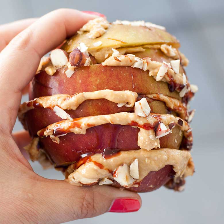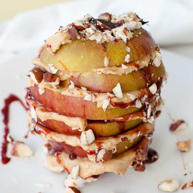 Apfel waschen, entkernen und horizontal in Scheiben schneiden. Daraufhin jede Scheibe mit Peanut-Revolution bestreichen, mit gehackten Mandeln und Kokosraspeln bestreuen und die Apfelscheiben aufeinander stapeln. Sobald der Apfel zu einem Turm gestapelt ist mit Kokosblütensirup toppen.