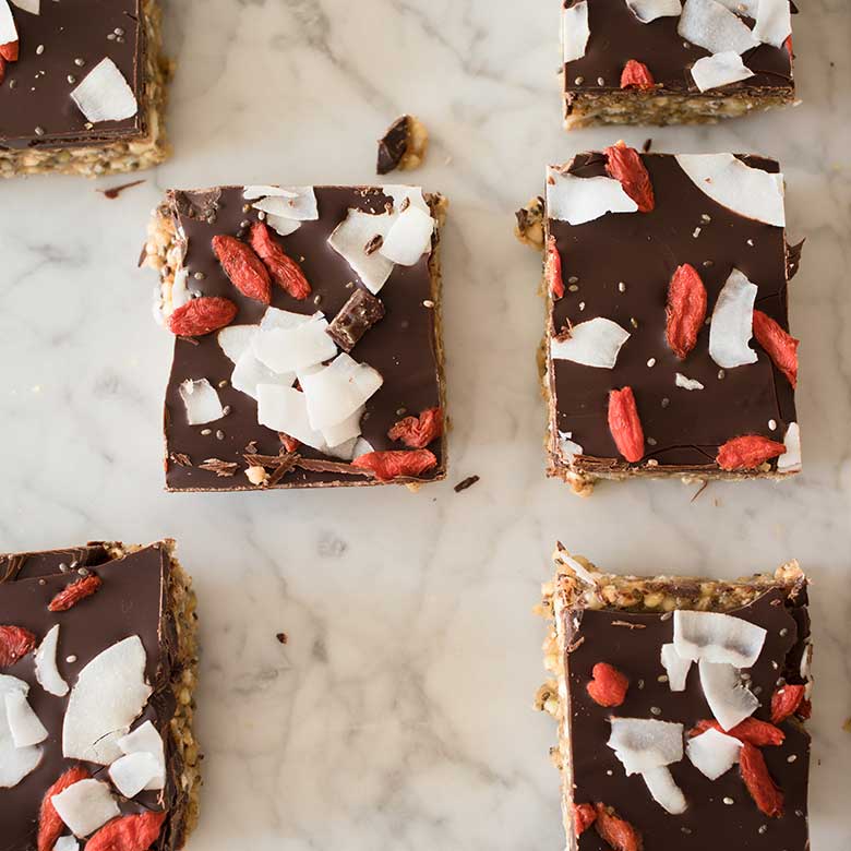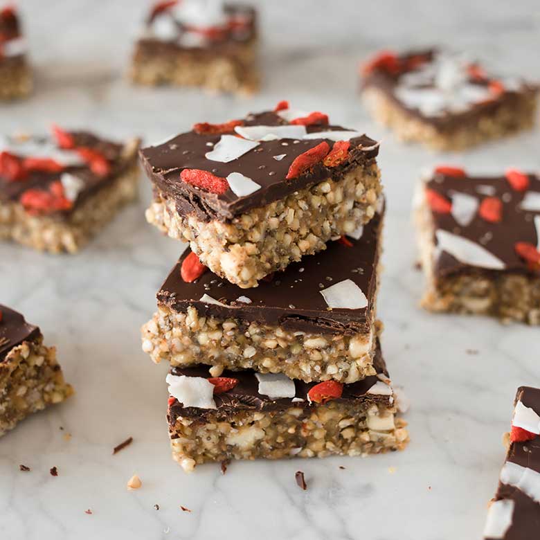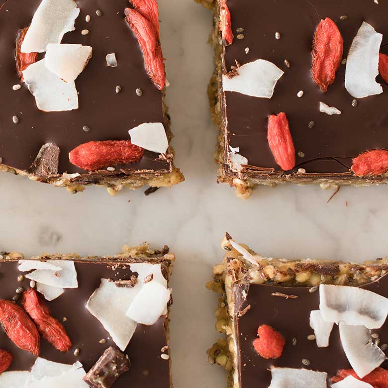 Optional Goji-Beeren, Kokos-Chips, Chiasamen oder Hanfsamen drauf streuen. Im Kühlschrank etwa 3 Stunden kalt stellen. In Quadrate schneiden und servieren.