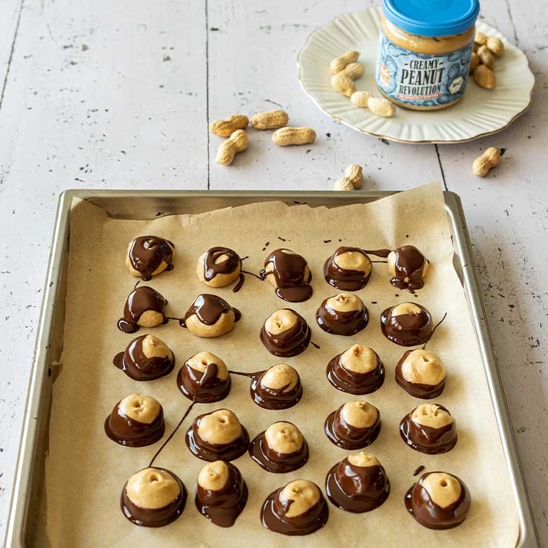 Die Kugeln bis zur Hälfte in die Schokolade dippen und erneut kühl stellen.