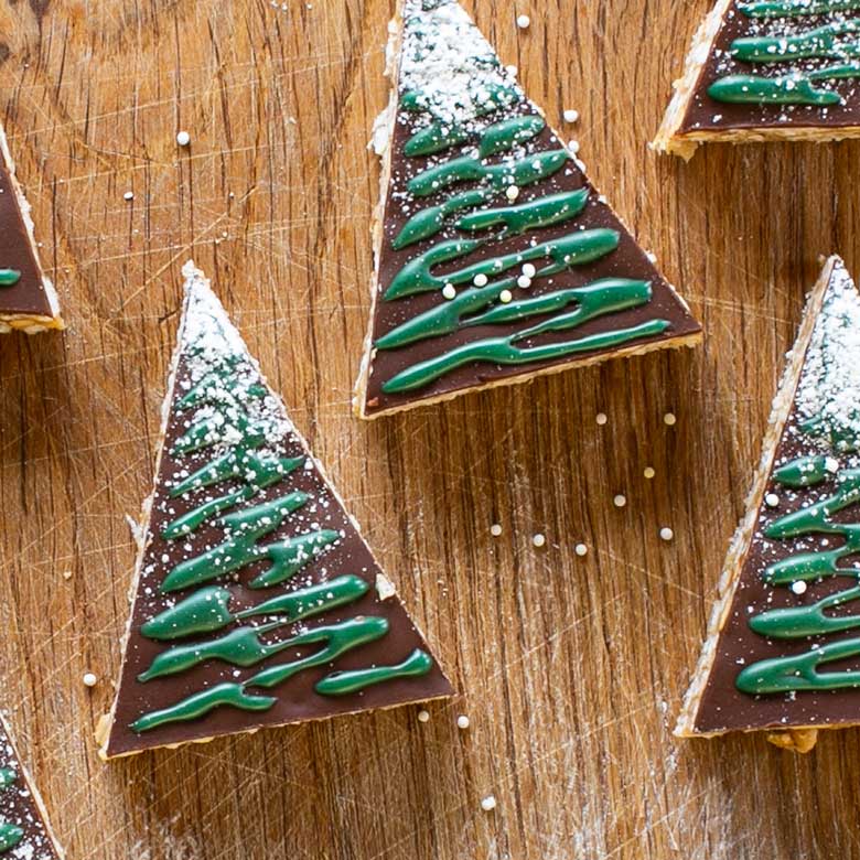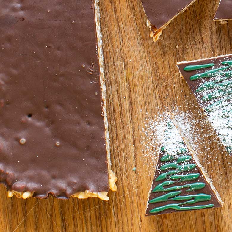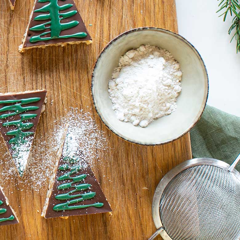 Die Puderzuckermasse in einen Spritzbeutel mit kleiner runder Spitze füllen. Zickzacklinien auf die Dreiecke spritzen – so schauen die Dreiecke aus wie kleine Tannenbäume.