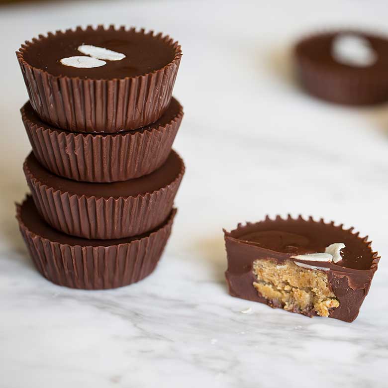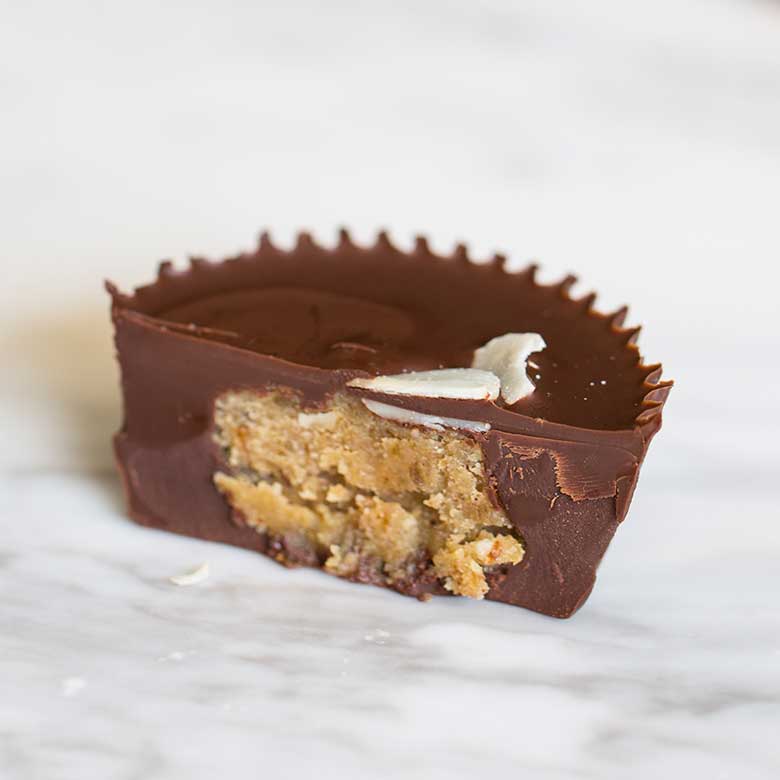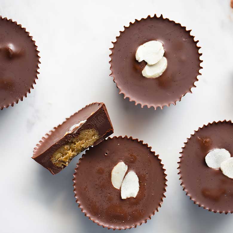 Ein Muffin-Backblech mit Muffin-Papierformen befüllen. Etwa 2 EL der flüssigen Schokolade in jede Form geben. Nun einen Teelöffel der Füllung auf die Schokolade geben und etwas verteilen. Die Füllung mit weiteren 2 EL Schokoguss abdecken und im Kühlschrank ganz auskühlen und hart werden lassen.
